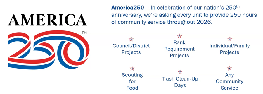 In celebration of our nation’s 250th anniversary, every unit is encouraged to complete 250 hours of community service during 2026. Whether through council projects, rank-requirement activities, family service, or simple acts of good turns, every hour counts—and every effort strengthens our communities. Start planning service projects as a council, district, unit, or family and strive for those 250 hours per unit throughout the year!