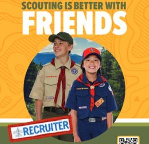 Whether it’s hiking a trail or tying their first knot, everything is better with a friend at your side! Earn your Recruiter patch by bringing a friend to Scouting and having them join!